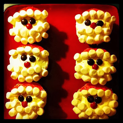 Cover the bottom half of the frosted cupcakes with mini marshmallows to form a beard. Place a single line of marshmallows on the on the top, about a 1/3 of the way down the cupcake to form the brim of Santa's hat. 2 brown M&Ms for the eyes, 1 red M&M for the nose and finally sprinkle the top 1/3 of the cupcake with red sugar to color Santa's hat.