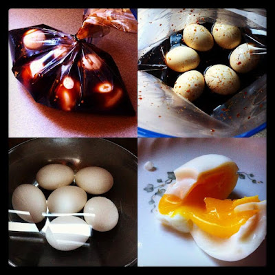 4: When eggs are cool enough to handle, peel them and add the whole eggs to the marinade. Be sure the eggs are submerged completely. Seal container.