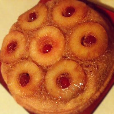 3. In a 10 inch cast iron skillet, melt 1/2 cup butter on the stove. Remove from heat, and whisk brown sugar into the melted butter. Make sure the butter/sugar mixture is spread around the skillet evenly. Arrange pineapple slices to cover bottom of skillet. Place a cherry inside each pineapple ring. Set aside.